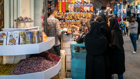 Kum, Iran - May 10, 2017: Famous Iranian market (bazaar) and women in black chodor choose goods
