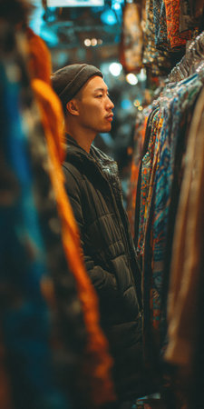 Young Asian man in beanie and jacket browsing clothing racks in a brightly lit boutique, thoughtfully choosing casual fashion pieces during a relaxed shopping trip