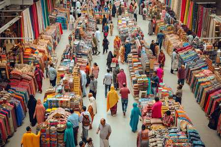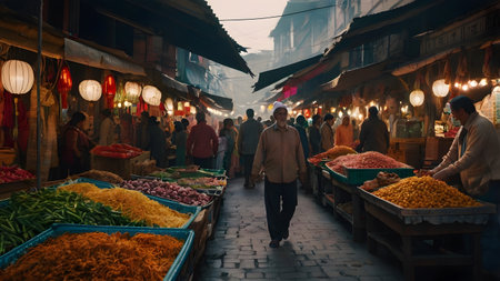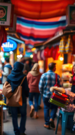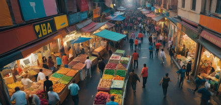 Bustling market scene showcasing vibrant stalls and diverse shoppers in a traditional bazaar during the afternoon