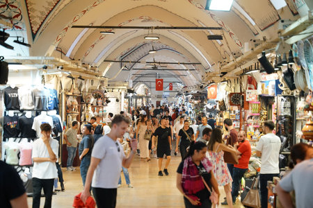 ISTANBUL, TURKIYE - SEPTEMBER 14, 2024: People shopping in the Grand Bazaar. The Grand Bazaar is one of the largest and oldest covered markets in the world.
