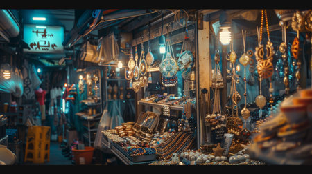 A bustling market scene with traditional jewelry and decorative items on display, featuring vibrant colors, intricate designs, and a variety of cultural artifacts.