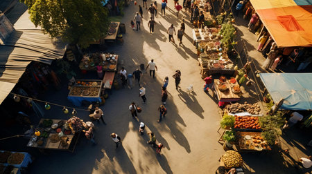 An aerial view of a bustling market filled with colorful stalls and shoppers engaging in commerce and exploration. The dynamic atmosphere captures urban living.