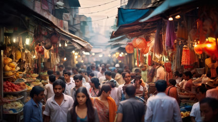 In this bustling market, a large number of people are seen walking around, engaging in various activities and shopping for goods, A bustling market during Ramadan, AI Generated