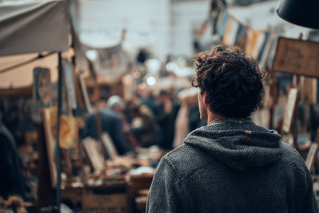 Man observing handmade objects and vibrant paintings while strolling through an outdoor flea market filled with unique finds and vintage treasures