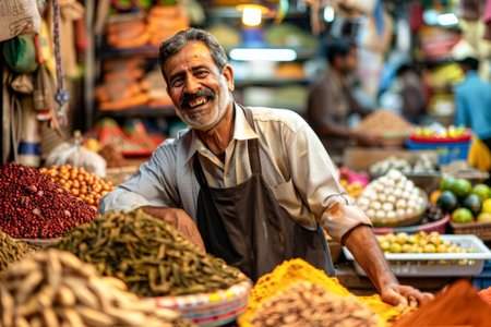 Senior man in traditional clothing inspects spices in a lively market, with an array of colorful herbs and powders creating a rich culinary atmosphere