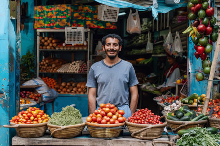 A friendly fruit vendor stands proudly before his colorful array of fresh produce, inviting passersby to enjoy the local bounty.