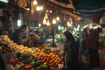A diverse group of individuals leisurely walking through a bustling market, exploring the various stalls and interacting with vendors, A bustling market during Ramadan, AI Generated