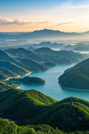 Lush green rice terraces nestled in mountainous landscape during early morning light