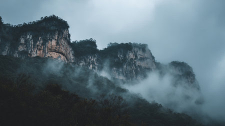 A captivating landscape showcasing dramatic cliffs shrouded in mist, surrounded by lush greenery under a moody, cloudy sky, evoking a sense of tranquility and beauty.