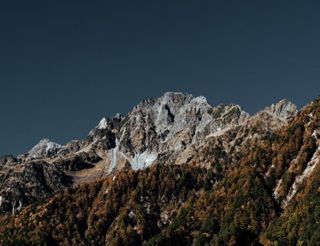 Jagged and dramatic mountain range with sparse snow under a cloudy blue sky in the Balagezong Grand Canyon, Shangri-La, Yunnan, China.