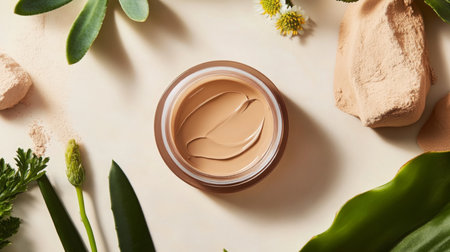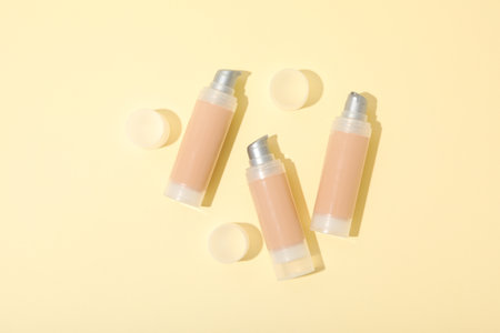 Makeup liquid foundation nude cream cosmetic bottle mockup on natural tone surface. Skin care beauty product mock up. Beige packaging concealer base container. Skincare primer template, cc corrector