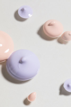 Cosmetic cream drop texture smudged on blue background, top view. White swatch of skin care product on nude surface.