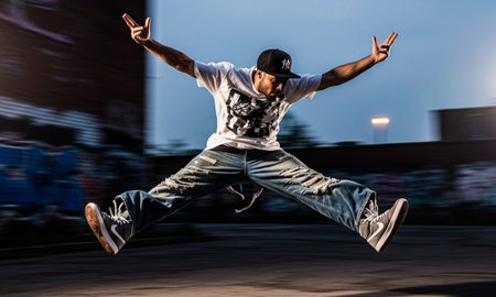 Energetic dancer performing hip hop moves in an urban setting, showing his talent and passion for street dance