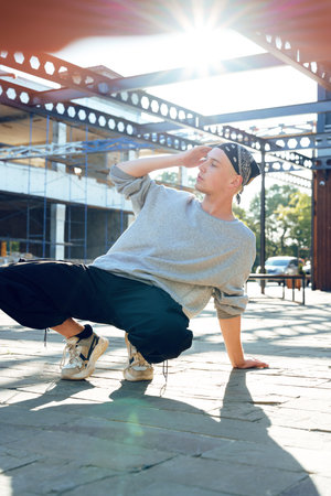 Unrecognized cool young man doing break dance moves in the street and having fun.