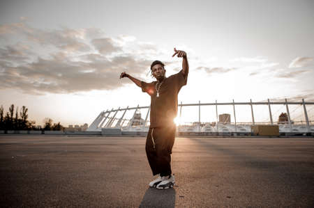 Outdoor full length portrait of the gesticulating afro american guy dressed in trendy black clothes