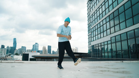 Skilled caucasian B-boy dancer practicing street dancing at rooftop with city sites or urban. Motion shot of young man performing street dance by doing freeze pose. Outdoor sport 2024. Endeavor.