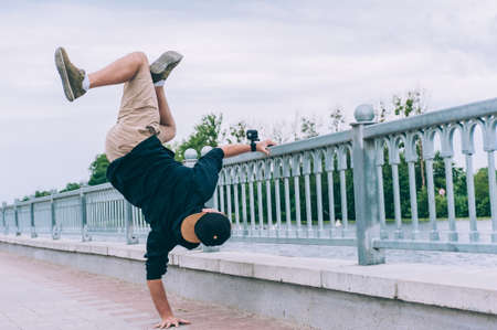 Male athlete, guy dancer summer city. Stand on one arm in air glasses. Fashionable modern break dance style fast, fitness sport hip hop motion. Urban culture, street dance. Acrobatic exercises