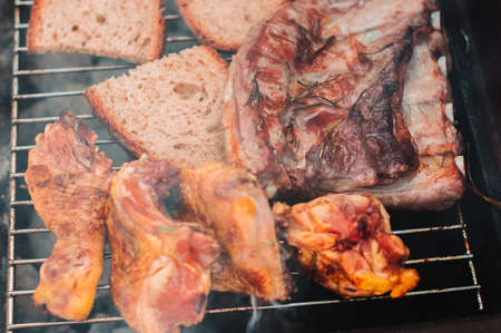 Roasted meat cooked at barbecue. Grill on charcoal and flame.