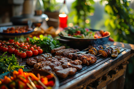 An inviting array of grilled meat, fresh vegetables, and salad served on a rustic wooden table, perfect for outdoor dining.