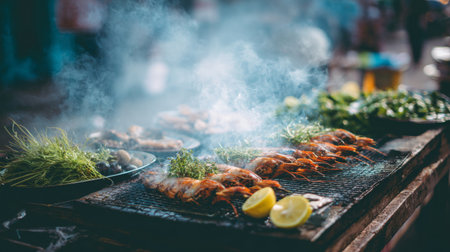 A vibrant scene showcasing fresh shrimp and seafood grilling over an open flame in a bustling outdoor market, infused with herbs and lemon.