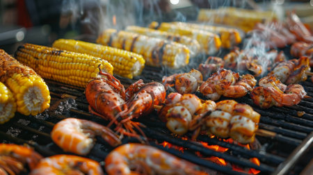A variety of seafood delicacies sizzling on the grill including lobsters shrimp and corn on the cob