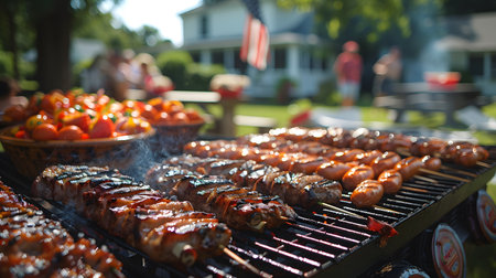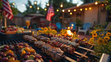 Close-up view of sizzling skewers on a hot grill at a lively Independence Day celebration