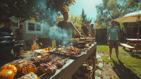 Tasty summer barbecue, friends gathered in a welcoming atmosphere., generative AI