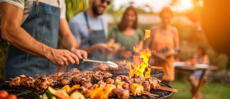 A joyful family enjoys a barbecue in their garden, grilling tasty skewers while basking in the warm sun. Laughter and conversation fill the air as they cherish the moment.