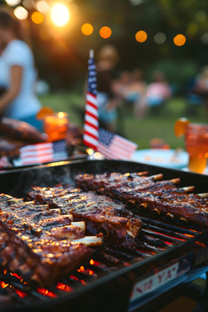 A lively backyard barbeque features ribs grilling, small American flags waving, refreshing drinks, people socializing and string lights creating a golden hour festive atmosphere.