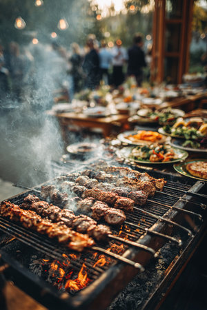 Sizzling pieces of meat are cooking on a barbecue grill, with steam rising into the warm evening air as the sun sets, creating a joyful atmosphere among friends and family.
