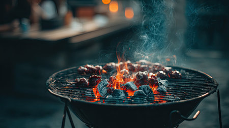 A vibrant scene of grilled meat sizzling over charcoal, surrounded by softly glowing flames. The smoke rises against a twilight background, evoking a sense of warmth and outdoor enjoyment. Perfect for showcasing culinary delights and summer gatherings.