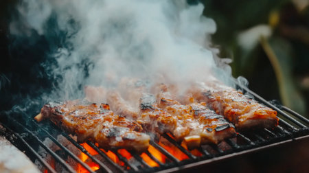 Mouthwatering grilled meat sizzling on a barbecue, enveloped in flavorful smoke. Ideal for summer gatherings and food enthusiasts seeking outdoor enjoyment.