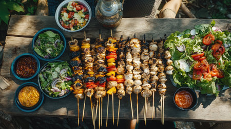 Enjoy a vibrant spread of barbecue skewers served with fresh salads and sides, perfect for outdoor gatherings and summer picnics.