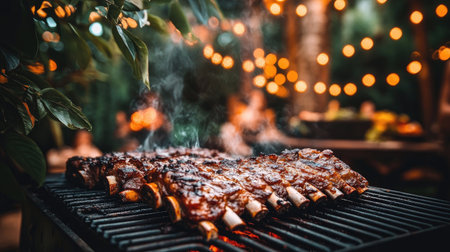 Delicious barbecue ribs sizzling on a grill, surrounded by soft glowing lights. Perfect for summer gatherings, outdoor dining, and food lovers.