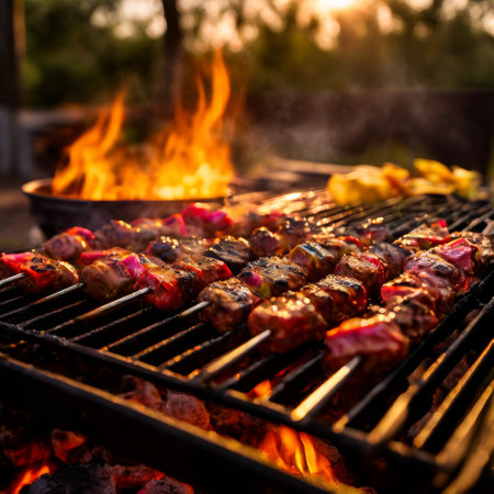 Vibrant grilled skewers featuring colorful vegetables and succulent meat over a charcoal fire, exuding delicious aromas and a summer vibe perfect for outdoor gatherings.