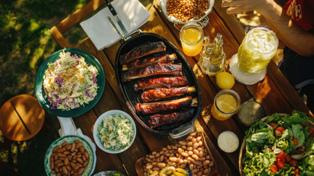 Celebration unfolds with a smoker preparing juicy ribs accompanied by colorful salads, beans, and refreshing beverages, all set outdoors on a sunny spring day.