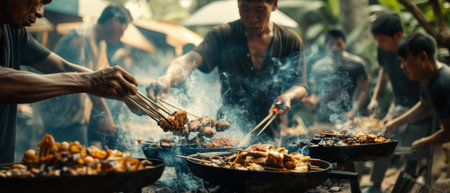 A lively scene of grilling skewers at a food market, with smoke rising and vendors preparing delicious meals. Perfect for showcasing culinary culture and outdoor dining.