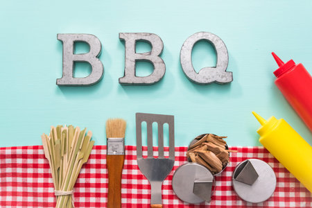 Barbecue with burning coals for cooking meat outdoors. Summer atmosphere and hiking with friends. High quality photo
