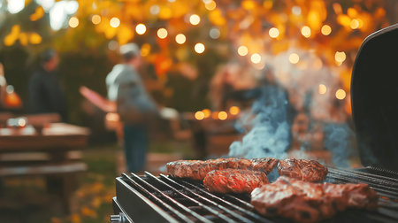 Grilled Steaks on Barbecue with Blurred Outdoor Party Background – BBQ Concept