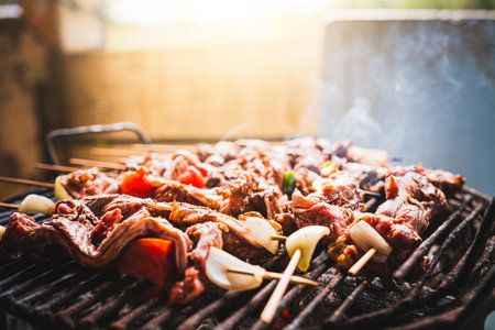 Closeup of kebabs with grilled potatoes in the background and smoke from the barbecue. BBQ party.