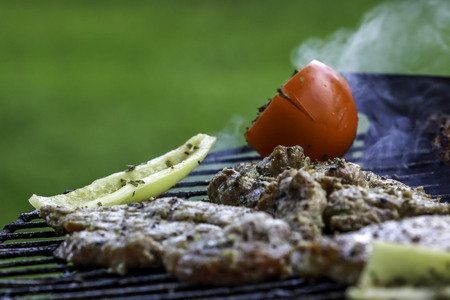 Grilling chicken meat skewers and skebab with vegetables on barbeque charcoal grill