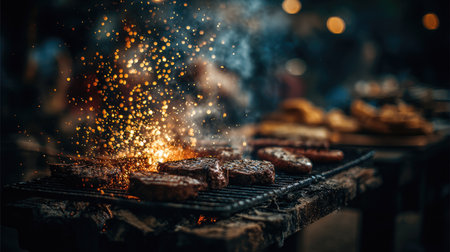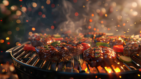 Juicy steaks, ribs, and sausages are sizzling on a grill filled with smoke on a warm day in the backyard.