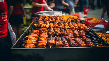 golden brown grilled chicken meat is cooked on the grill outdoors