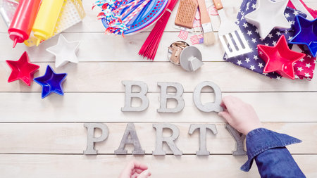 BBQ Party sign with July 4th decorations on a wood boards.