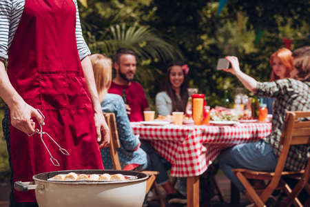 Close-up of man grilling food during outdoor birthday party in the summer