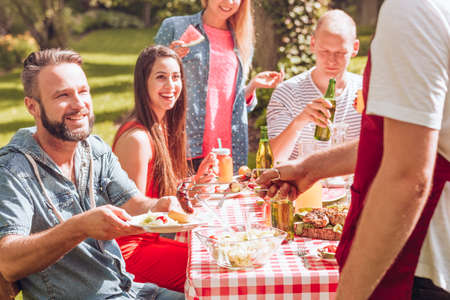 Small group of friends drinking alcohol and having a meal at barbecue party