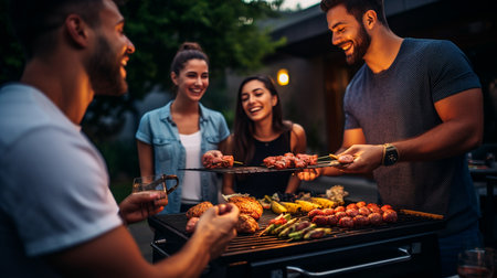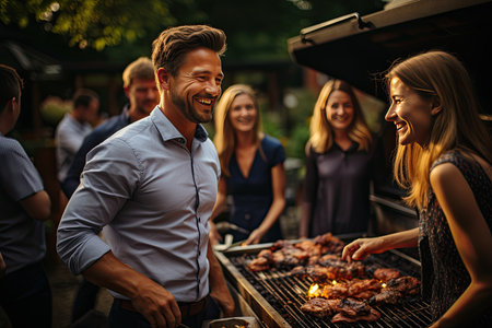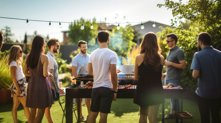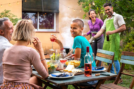 Group of friends making barbecue in the backyard at dinner time