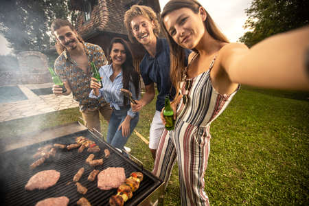 Pretty young woman making a barbecue selfie with her friends