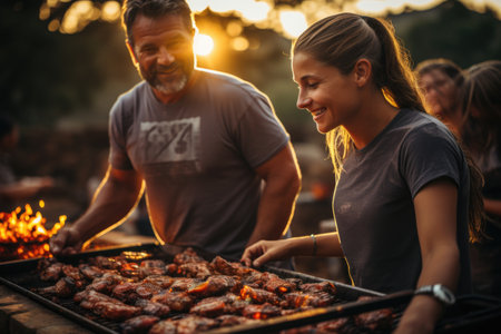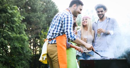 Happy friends grilling meat and enjoying barbecue party outdoors.