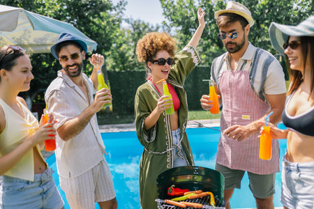 A group of young people enjoys a lively summer day by the pool, sipping colorful cocktails with straws, wearing swimsuits and grilling food at a barbecue.